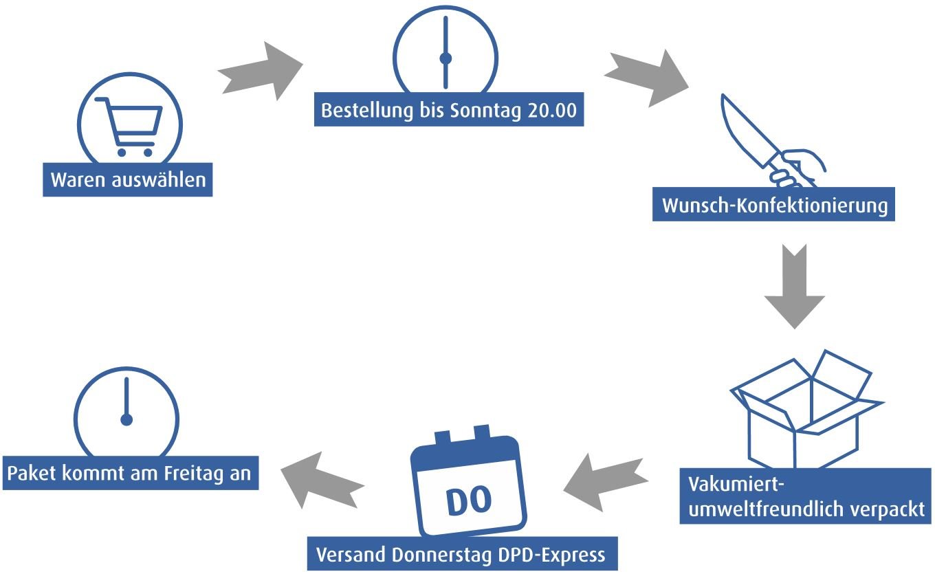 • Deine Bestellung wird für Dich top-frisch zusammengestellt, Vakuum verpackt und gekühlt.