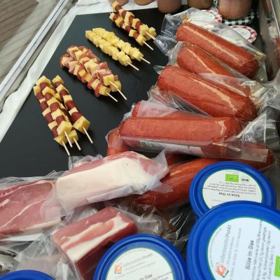 Ein Renner waren unsere “Hausmacherwürste im Glas“. Auch unsere Salami-Käse-Spieße kamen super an. Den Käse dazu haben wir von unseren Freunden vom “Biohof Kaemena“, dazu unsere Pfefferbeisser oder Sommermettwurst… voilà