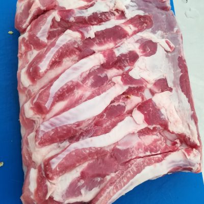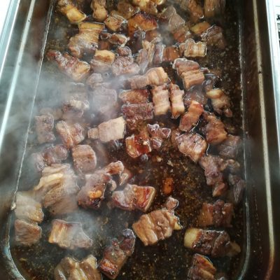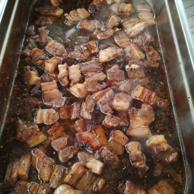 Die Schwarte vom Schweinebauch abschneiden und das Fleisch dann in ca. 3 cm breite Stücke schneiden.