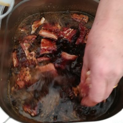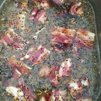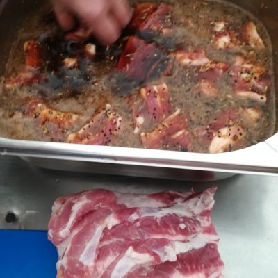 Nun legen wir die Schweinebauchscheiben für mindestens 30 Minuten (lieber einiges länger) in die Marinade.
