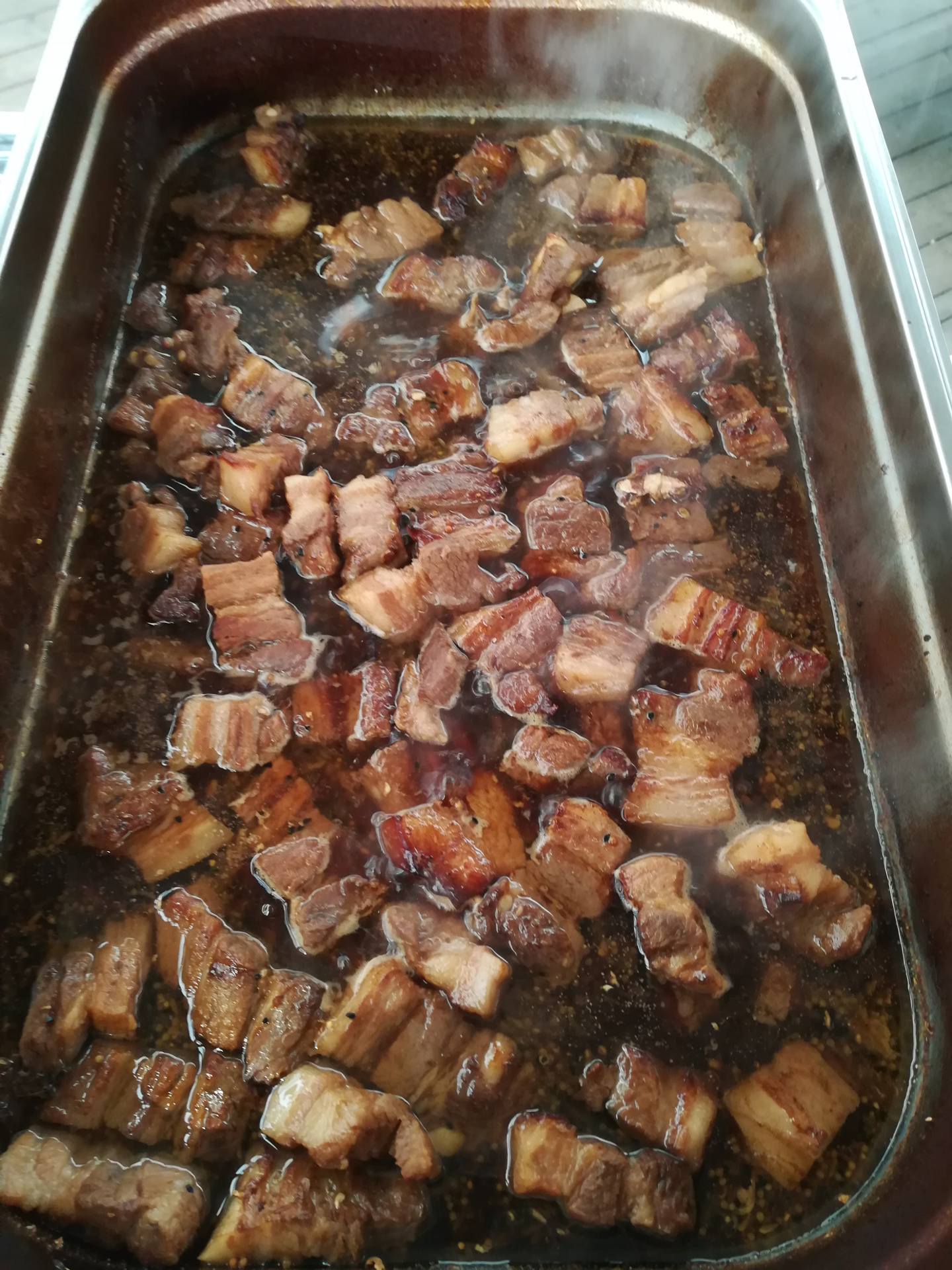 Den Schweinebauch geben wir nun auf ein Blech und schieben es bei zuerst 70°C für 40 Minuten in den Ofen (mittlere Schiene, keine Umluft)). Dann erhöhen wir die Temperatur für 25 Minuten auf 220 °C.