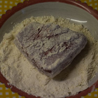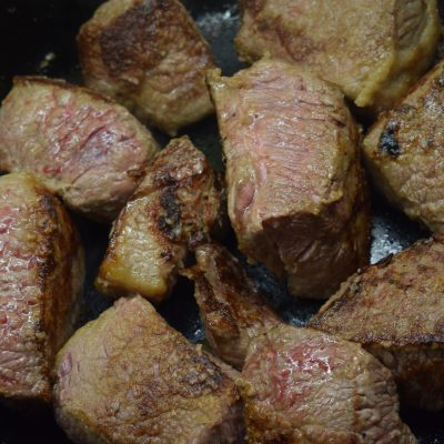 Das Rindfleisch ( Braten, am Besten aus der Schulter) in ca. 5 cm große Stücke schneiden, mit Salz und Pfeffer würzen, im Mehl wenden und abklopfen.