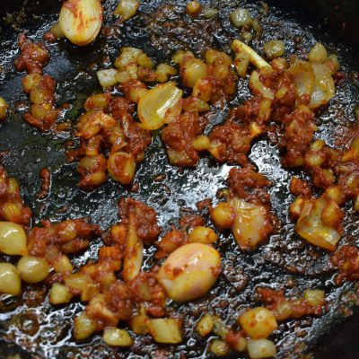Wieder etwas Öl in den Bräter geben, darin das Fleisch von allen Seiten scharf anbraten und dann herausnehmen. Den klein gewürfelten Speck in den Topf geben und glasig werden lassen. Tomatenmark dazugeben und unter Rühren kurz rösten.