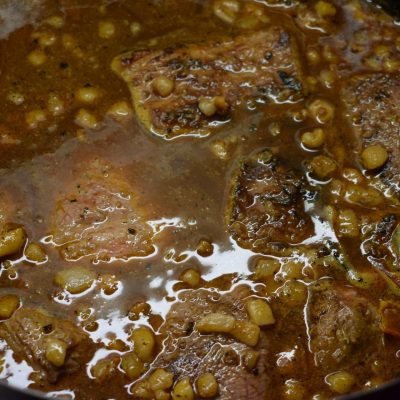 Den Wein unter Rühren fast vollständig verkochen lassen und dann den Rest Wein dazu gießen. Fleisch und Rinderbrühe dazu geben, aufkochen und bei mittlerer Hitze etwa 2,5 Stunden schmoren.