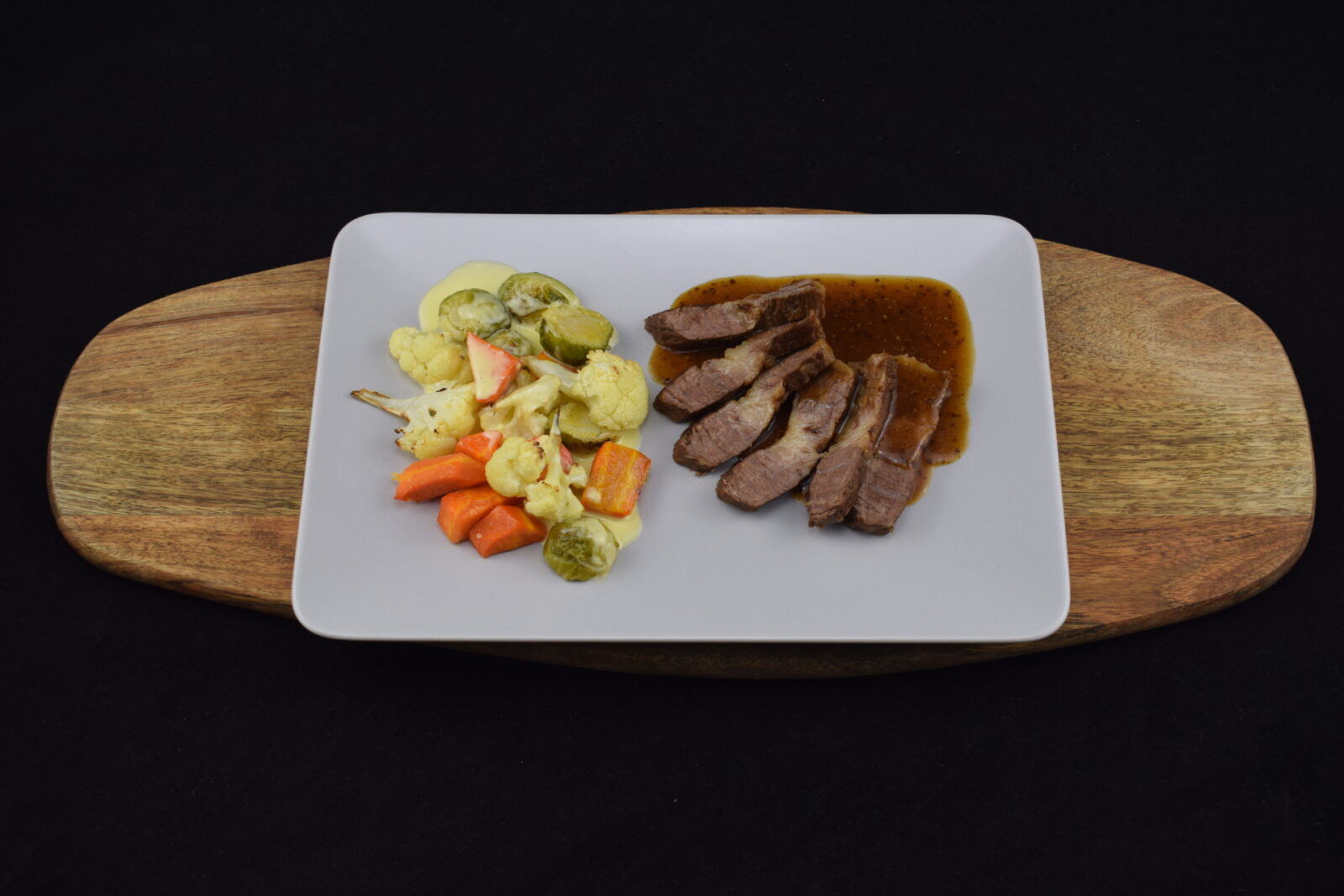 Nun müssen wir nur noch das Fleisch aufschneiden und mit Gemüse und Soße anrichten.