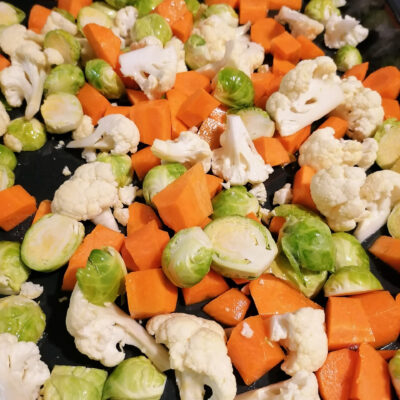 In der Zwischenzeit widmen wir uns dem Gemüse. Viele Gemüsesorten eigen sich hervorragend zum schmoren auf dem Blech im Ofen. Wir haben uns in diesem Fall für Rosenkohl, Karotten und Blumenkohl entschieden. Das Gemüse schneiden wir auf gewünschte Größe und verteilen es auf einem Backblech… etwas gutes Olivenöl drüber, etwas Salz und ab in den Ofen. Ob ich das Gemüse lieber noch etwas knackig oder kross haben möchte, entscheidet über die Dauer im Ofen.