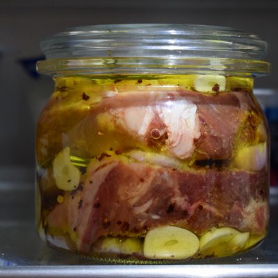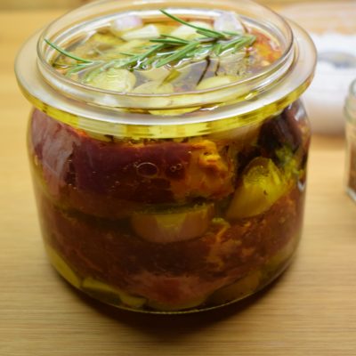 Als erstes schneiden wir die Zwiebeln und den Knoblauch in etwas kleinere Stücke. Nun schichten wir das Fleisch und die weiteren Zutaten (Knobi, Zwiebeln, Chilli, Rosmarin) übereinander im Einmachglas. Das ganze füllen wir mit Öl (wir haben erhitzbares Olivenöl genommen) auf, so dass alles bedeckt ist. Jetzt geben wir dem Ganzen genug Zeit zum “aromatisieren”. Am Besten, lassen wir das Glas über Nacht im Kühlschrank stehen…