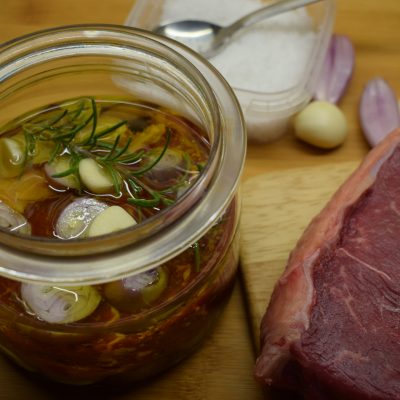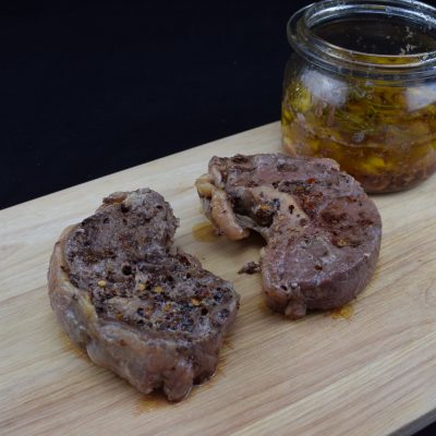 Wir nehmen ein ausreichend großes Einmachglas, so dass das Bio-Rumpsteak gut hinein passt und noch etwas an Gewürzen und anderen Leckereien. Aber nicht zu groß, da sonst zuviel Öl benötigt wird, um alles zu bedecken.