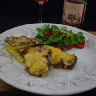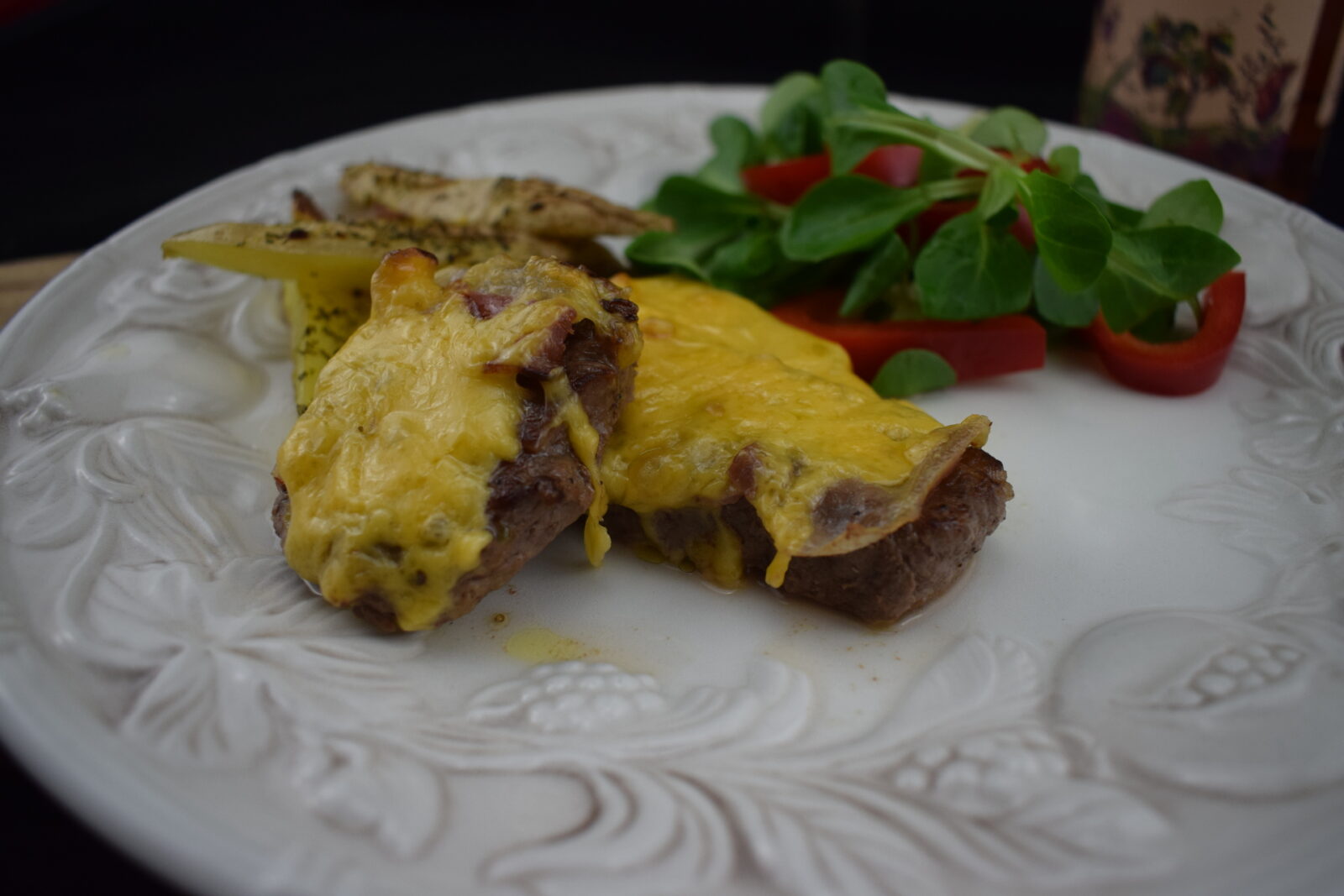 Das Fleisch ist nun super saftig, und der Bacon mit dem Cheddar gibt dem Ganzen einen besonderen Geschmack.