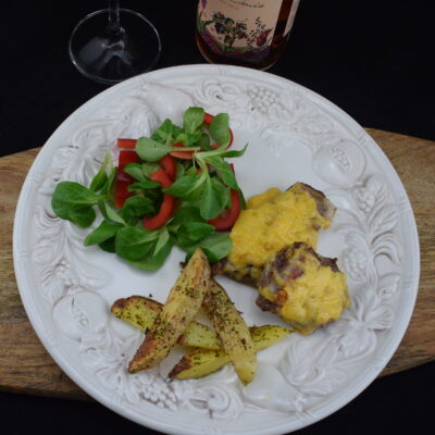 Zirka 10 Minuten, bevor die Kartoffeln fertig sind, geben wir das Blech mit den Steaks in den Ofen zu den Kartoffeln.