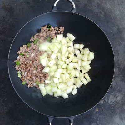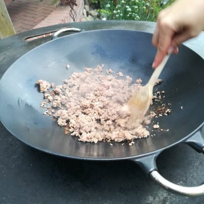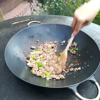 Als Erstes braten wir das Hackfleisch in etwas Öl scharf an, bis es schön krümelig wird. Dazu geben wir dann die Lauchzwiebeln und den Knoblauch.