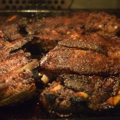 Nun verteilen wir das Fleisch auf dem Backblech und rösten das Ganze für 2 Stunden bei 150°C im Ofen (zwischendurch 1x wenden). Abschließend kann der Grill vom Ofen noch kurz dazu, falls die Ribs noch nicht knusprig genug sind.