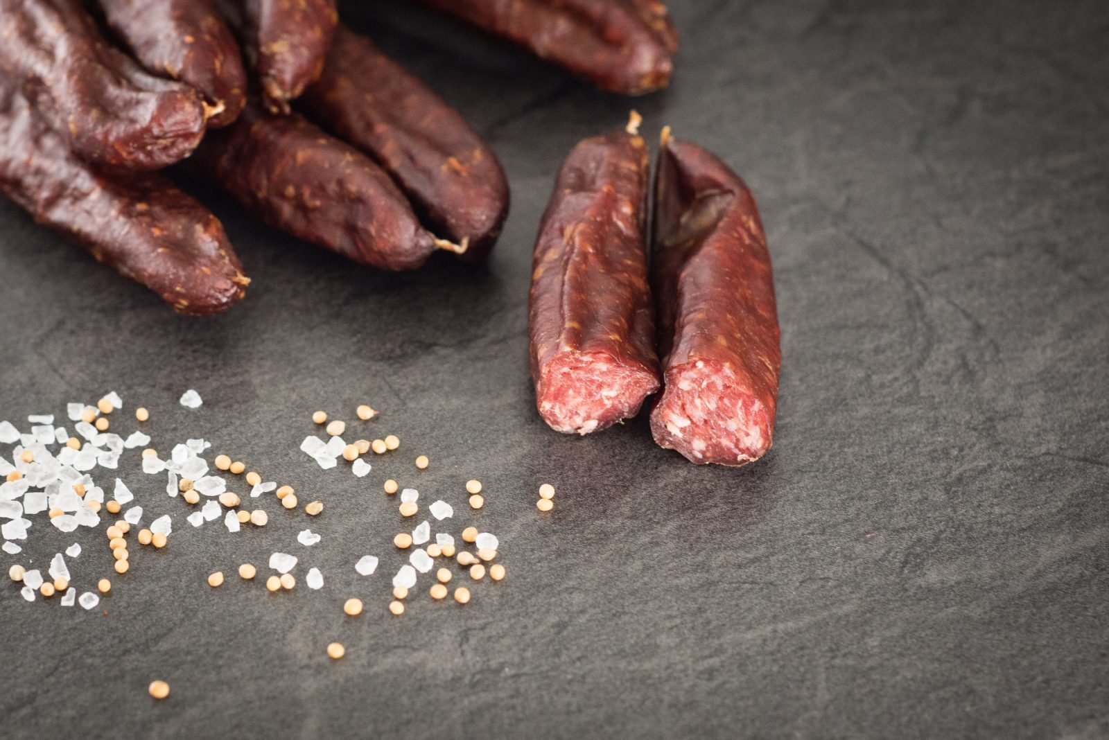 Inhalt: Bio Lamm-Rind Pfefferbeisser, ca. 130g Zutaten: Bio-Lammfleisch*, Bio-Rindfleisch*, Meersalz, Speisesalz, Senfsaat*, Ingwer*, Kräuter*, Gewürze*, Konservierungsstoff (Natriumnitrit), Naturdarm, Buchenholzrauch; Ohne Zusatz von Gluten, Lactose, Geschmacksverstärkern, Farbstoffen, Aromen *aus kontrolliert biologischen Anbau; Allergene Stoffe: Senf Haltbarkeit: bei Lagerung unter +7 °C i. d. Regel zu verbrauchen innerhalb von 13 Tagen (siehe Etikettierung) Gewicht: Das Gewicht kann von 100g -…
